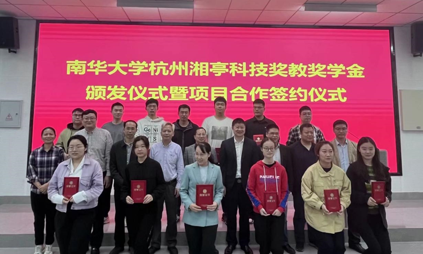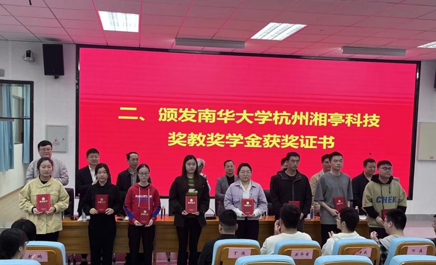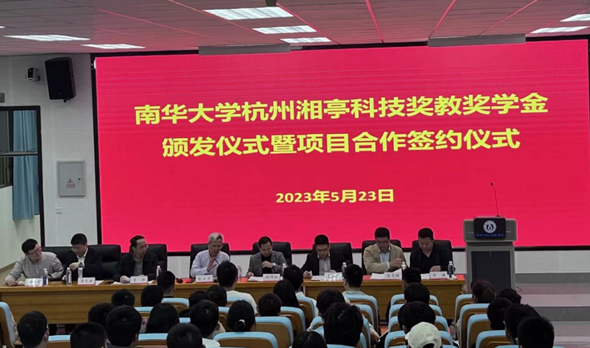5月23日,杭州湘亭科技奖教金、奖学金颁奖仪式暨项目合作签约仪式在vsport胜利因您更精彩核学楼核应急报告厅举行,杭州湘亭科技有限公司(以下简称“湘亭科技”)总经理何帅兴、副总经理曹明月、质量部经理李海、vsport胜利因您更精彩学工部部长李照、教育发展与员工联络办公室主任李先国、知识产权与技术转移中心副主任吴小军、公司党委书记赵立宏、党委副书记马军、教师代表朱智超、各年级员工代表及奖教奖学金获得者出席本次仪式。仪式由赵立宏主持。