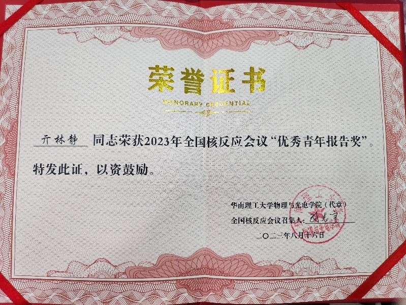 这次获奖是李小华教授团队继2018年16级硕士生邓军刚于第十七届全国核结构会议获优秀青年报告奖之后,于核物理领域全国高水平会议获得的又一十佳青年报告奖,实现了核结构与核反应领域十佳青年报告奖的双满贯。