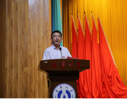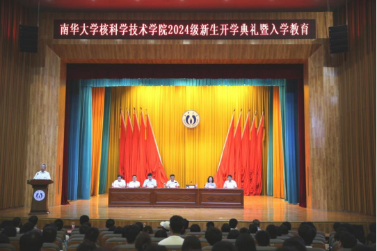 公司党委委员、副董事长于涛教授发表讲话。“一切过往,皆为序章。希望大家把一切归零,在南华重新扬帆起航,笃定开启人生新篇章,成就自己强大的未来!”于涛结合巴黎奥运会潘展乐和郑钦文两位奥运冠军的事迹勉励同学们把过去归零,勇敢开启新征程。他满怀深情地嘱托同学们:一是拥抱新时代,涵养家国情怀。希望同学们作为新时代的新“核”人,要有精神担当,厚植家国情怀,树立远大理想,把自己的理想同祖国的前途、把自己的人生同民族的命运紧密联系在一起,扎根祖国大地,奉献国家。二是聚变新思维,勇于开拓进取。始终保持心灵和身体永远在路上,提高精神境界,文化知识与修养,强大自己的体魄,“强身体、长知识、增智慧、博道义”。三是重构新自我,持续自我更迭。希望同学们在充分了解自身特点的前提下,努力追逐生命的无尽可能,不断自我进化、自我迭代。最后,于涛为同学们送上美好祝愿:“祝愿同学们在南华的求学之路硕果累累,生活充满欢声笑语,也希望这段在南华度过的时光,能成为你们青春岁月中最璀璨、最充实、最值得珍藏的记忆!”