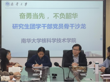随后,马军老师对大家提出了几点要求:一、作为团学干部党员骨干一定要自觉抵住世俗的喧嚣,用自己的一言一行向广大同学传递积极向上的力量;二、作为团学干部党员骨干一定要主动提高自身服务同学的意识和能力,在工作中提高自身素质,牢记“只做员工友、不做员工官”的宗旨;三、作为团学干部党员骨干一定要从发扬核院特色为出发点,在工作中要有大格局意识,要在提高研究生学术水平、科研发展等方面多做工作,各年级之间要做好工作的科学传承,共同营造核院研究生良好的学术氛围。