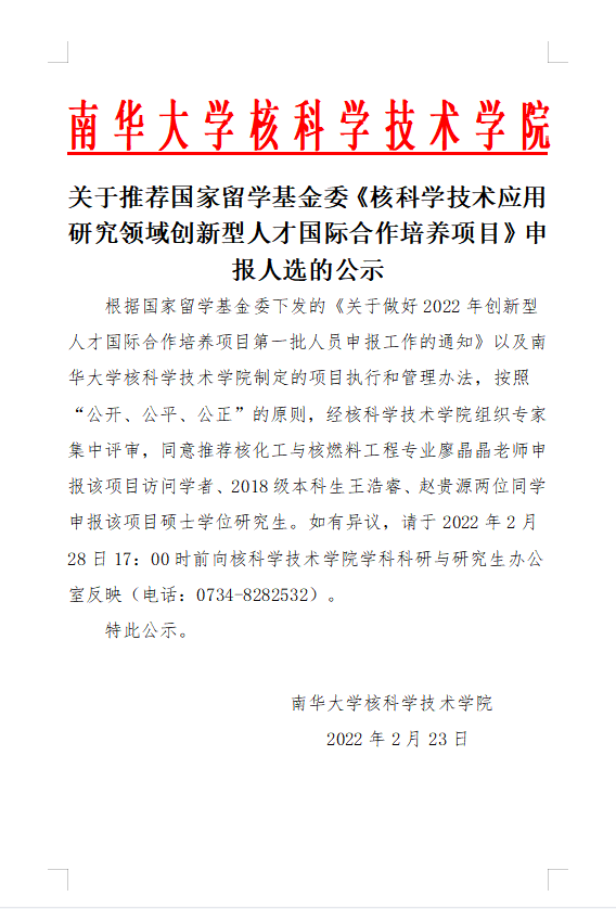 关于推荐国家留学基金委《核科学技术应用研究领域创新型人才国际合作培养项目》申报人选的公示