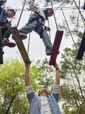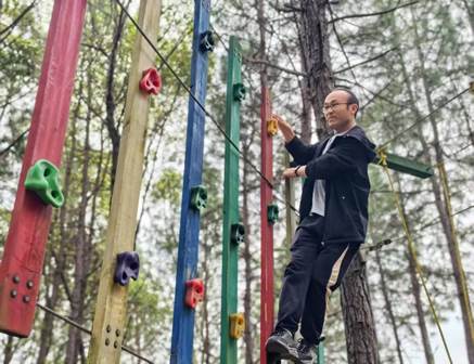 下午,教职工们迎来充满挑战与刺激的丛林穿越活动。在山水莲花的丛林秘境中,大家身着专业装备,穿梭于茂密的树林间,在绳索、吊桥等关卡中相互鼓励、携手前行。一路上,不仅锻炼身体与勇气,更增进同事间的信任与协作,共同探索自然的奥秘,领略春日里山水独特的生态之美。