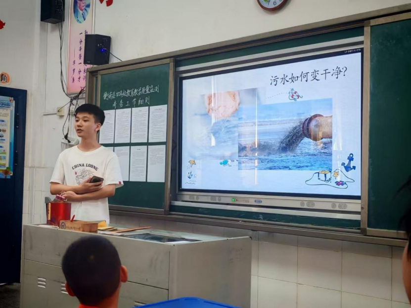 “污水如何变干净?”课堂伊始,实践团成员吴正武一个贴近生活的问题,瞬间抓住了孩子们的注意力。清澈清水与浑浊异味的污水,让孩子们深刻感受到水质差异。随后,成员们引导孩子们思考雨后积水的去向——从“太阳蒸发”到“土壤下渗”,初步认识自然水循环,并巧妙过渡到与生活息息相关的“自来水净化过程”,揭示其背后的科技力量。