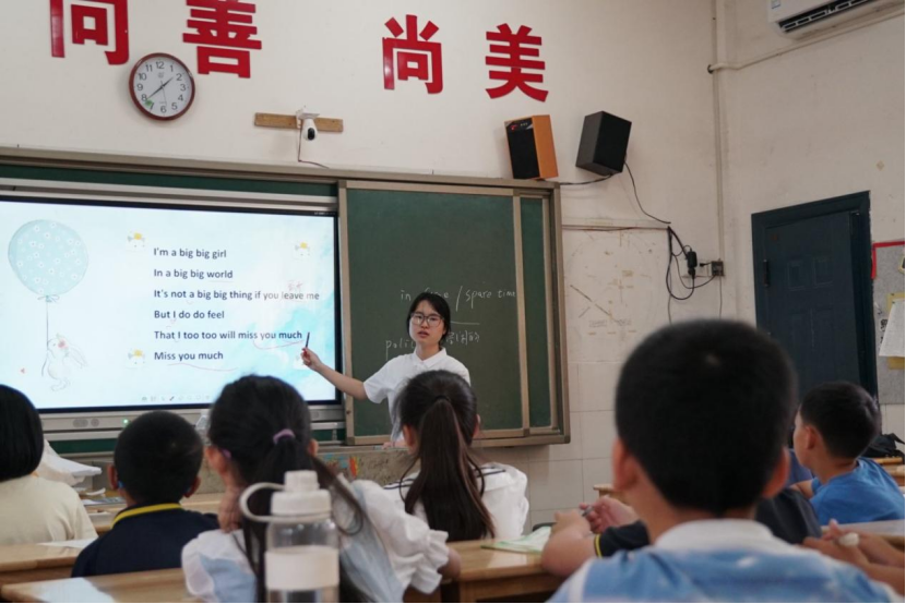 “Hello, everyone! My name is...” 在实践团成员向文丽老师的趣味引导下,英语课以自我介绍轻松破冰。孩子们从最初的羞涩尝试,到勇敢地用简单英文介绍姓名和爱好,眼中闪烁着学习的兴奋。课堂随后进入经典英文歌曲《Big Big World》的沉浸式教学。向文丽逐句示范,孩子们专注跟唱。当稚嫩却响亮的“In a big big world...”旋律回荡教室,这不仅是一次语言学习,更是一次面向广阔世界的“初声号角”,悄然在孩子们心中播下了英语学习的兴趣种子。