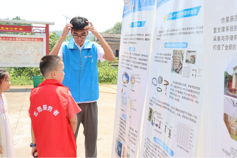 在核科普方面,服务团同样开展了丰富多彩的活动。成员们通过展示科普展板、分发书籍资料、利用PPT演示,向孩子们讲解了核聚变原理并介绍了仿星器装置等前沿科技,为孩子们普及了核基础知识、核安全常识以及核技术在医疗、能源等日常生活中的广泛应用,有效传递了核科学的广泛性和重要性,增进了认知。