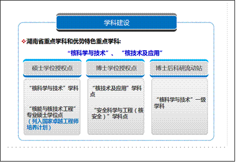 公司拥有核科学与技术湖南省重点学科和湖南省优势特色重点学科,现有核科学与技术一级学科博士后科研流动站、核技术及应用博士点、安全科学与工程(核安全)博士点和核科学与技术一级学科硕士点;具有核能与核技术工程工程硕士学位授予权、核技术及应用高校教师在职攻读硕士学位授予权和核科学与技术卓越硕士培养计划。