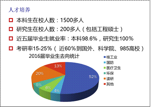 (4)与中国原子能科学研究院、中国科公司应用物理究所、中国辐射防护研究院等建立了长期稳定的校外实践基地。本科生平均就业率在99%以上,受到用人单位欢迎。