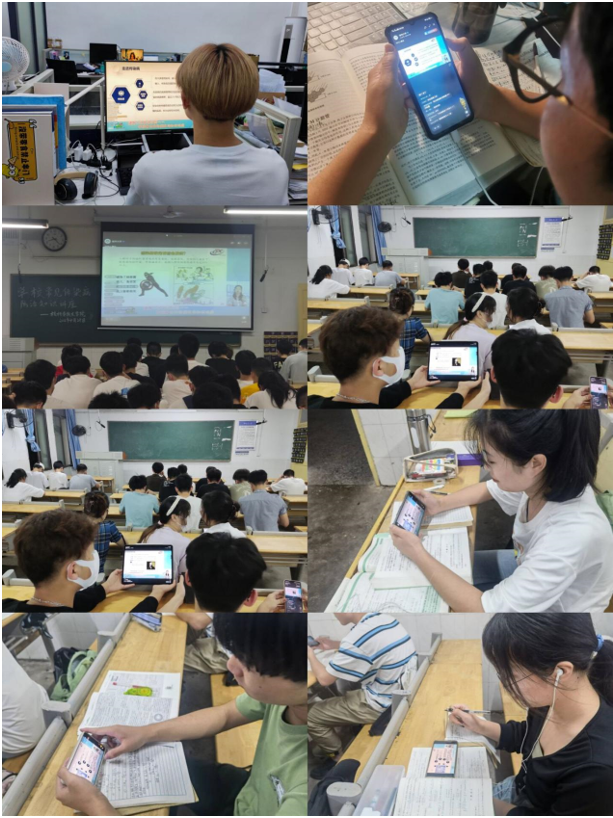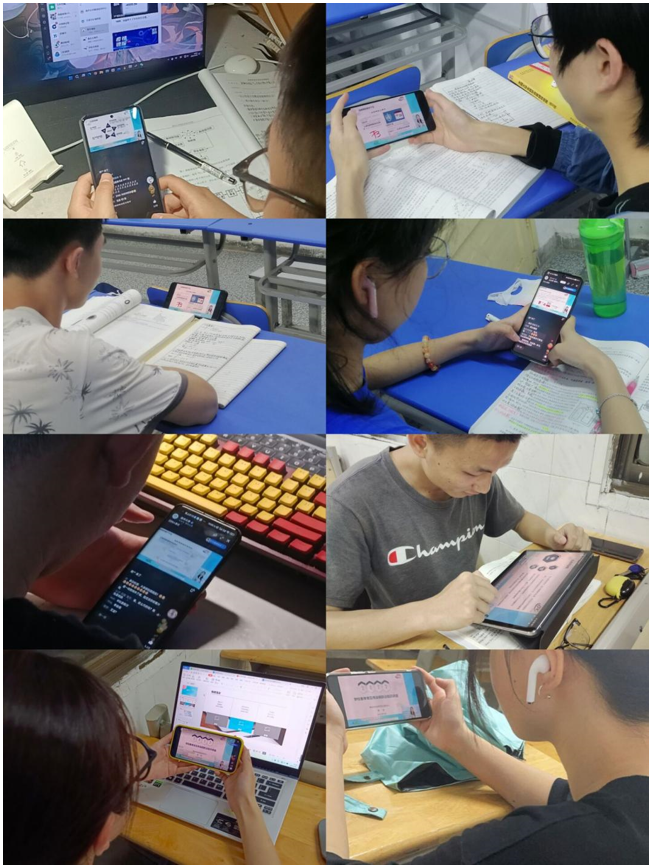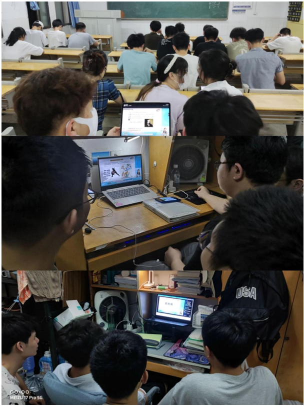 教室里、宿舍里,老师和同学们在不同场所里认真收看直播,仔细记录笔记,学习氛围浓烈。