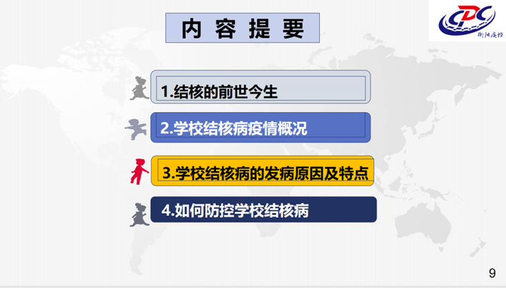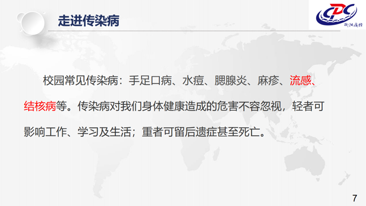 讲座中,衡阳市疾病预防控制中心的黄颖老师以“走近传染病”为引题,介绍了传染病的概念、类型、传播途径、校园常见传染病的类型和防护等相关知识,并从结核的前世今生、公司结核病疫情概况、公司结核病的发病原因及特点、如何防控公司结核病等四个方面重点普及肺结核预防知识,倡导师生养成出入公共场所佩戴口罩、勤洗手保持手卫生、注意咳嗽礼仪等文明健康的生活方式和卫生习惯,提倡合理营养和科学运动、保持充足睡眠、接种疫苗,提高抵御疾病的能力。