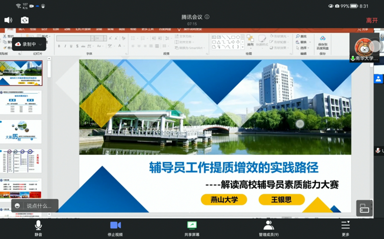 2022年5月6日上午,在第九届湖南省高校辅导员素质能力大赛前夕,湖南省“同心圆梦”思政团队和vsport胜利因您更精彩辅导员职业发展协会举办了2022年5月辅导员沙龙,本次沙龙的主题是“辅导员工作提质增效的实践路径——解读高校辅导员素质能力大赛”,主讲嘉宾为第六届全国高校辅导员职业能力大赛(现改名为“辅导员素质能力大赛”)决赛一等奖获得者、第十届全国辅导员年度人物、2020年全国最美辅导员、现燕山大学员工工作部副部长王银思老师。沙龙采取腾讯会议线上方式进行,由湖南省“同心圆梦”思政团队负责人和vsport胜利因您更精彩辅导员职业发展协会会长马军老师主持。vsport胜利因您更精彩员工工作部部长李照、副部长卢清华、旷勇、崔泽文以及辅导员同仁们参加了沙龙。