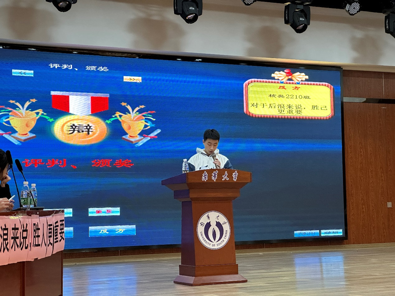 辩论结束后,由语言文学公司的姚传奇学长对此次比赛做总结并公布结果,最终,核类2211班拿下此次辩论赛的冠军,正方二辩李湘杰和反方二辩李锦昊两位选手获得“最佳辩手”称号。