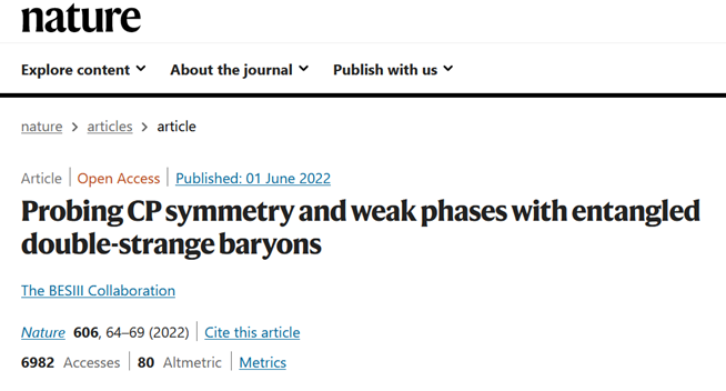 近日,北京谱仪III(BESIII)实验国际合作组发表了该合作组自成立以来的第一篇Nature文章——“Probing CP symmetry and weak phases with entangled double- strange baryons”。这是BESIII实验继发表Nature Physics之后,又一重要的里程碑工作。