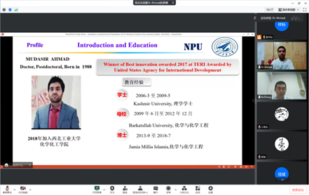2022年9月8日晚上,正值教师节和中秋节来临之际,来自西北工业大学的印度籍Mudasir Ahmad博士受邀远程给核院师生作了题为“New Materials Synthesis for Energy and Environment Sustainability”的学术报告。报告由副经理郑波教授主持,部分教师、研究生参加了此次学术交流。