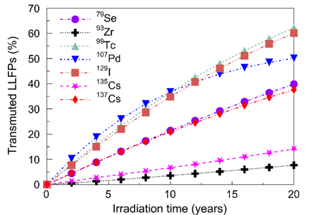 罗文课题组与合作者基于伽马嬗变和中子嬗变原理,提出了一种伽马中子源(PNS)驱动的先进核能系统(ANES)的概念设计,用于无需同位素分离的LLFPs高效嬗变。这种ANES可以同时实现LLFPs的嬗变和核能的产生。后者可平衡PNS装置的能量消耗,意味着这种核嬗变系统不需要外部的能量供给,多余的电能还可用于并网发电。本工作中,作者研究了ANES布局对于嬗变效率的作用影响,发现了ANES的铅铋层和铍层可将PNS的利用率提升10倍。假定ANES在500 MWt的热功率下运行20年,99Tc、129I、107Pd、137Cs和79Se等5种LLFPs的嬗变率超过30%。因此,它们的有效半衰期从约106年下降至不到102年。研究结果表明,ANES的成功实施有望为无需同位素分离的LLFPs嬗变开辟了一条崭新通道。