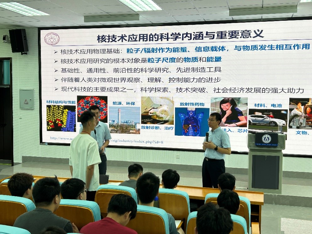 王学武教授首先介绍了清华大学工程物理系自建系以来,始终以满足国家重大战略需求为己任,锐意进取、攻坚克难,坚持“理工结合,又红又专”的人才培养理念。随后在报告中围绕工物系近年来的研究重点,分别介绍了工物系在辐射成像安全检测技术、中国锦屏极深地下实验室探测实验、新型激光加速器技术、极紫外光源、粒子诊疗与治疗方面开展的工程技术难点攻关、技术成果转化等工作。并从锦屏极深地下实验筹建、探测器中高纯锗晶体制备技术攻关、分布式X射线源的静态CT系统搭建等实例,分享了关于物理原理、工程技术以及成果转化之间的如何关联辅助,产生重大具有社会应用价值成果的相关经验。王学武还以员工科创活动“天格计划”支持“追光少年”们开展自己的大科学计划为例,鼓励同学们在创新驱动发展中建功立业。希望同学们既要拥有扎实的数理知识,又要掌握熟练的工程技能,力求把自身培养成为适应社会需要的优秀人才。报告提问环节,同学们围绕静态CT、μ子测量、福岛核污水、机器学习在核技术应用领域中的相关应用以及一些“卡脖子”问题等方面进行了提问,王学武教授分别进行了专业细致的解答。