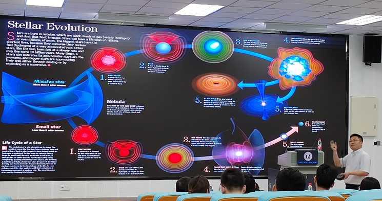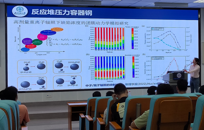 报告会上,苏俊教授首先介绍了北京师范大学的悠久历史文化,从京师大学堂师范馆到如今“双一流”的综合性大学的历史成就。然后叙述了其核科院的发展特色,并欢迎公司员工于此深造。最后苏俊教授深入浅出的讲解了锦屏深地的核天体物理实验,从核天体的浪漫到锦屏深地的天然优渥条件。随后,吕沙沙副教授以材料学的角度介绍了核能材料辐照效应及反应堆的发展与类别,并展示了射线束技术的前沿应用,如离子辐照与离子束分析平台,CDEX实验计划与基地本底辐射物理研究。
