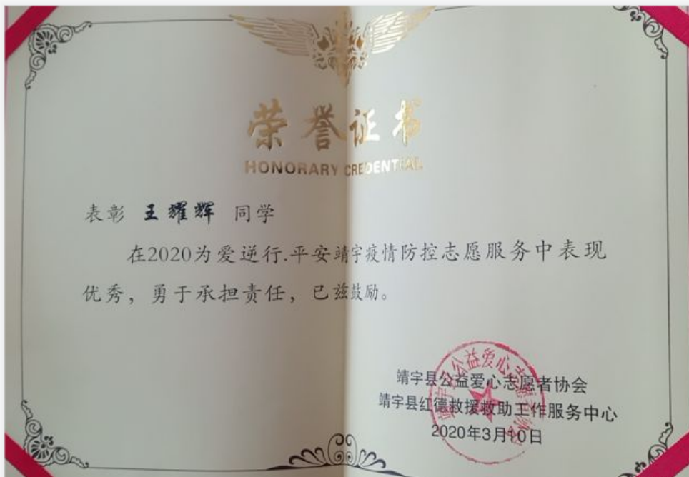 王耀辉同学获得靖宇县疫情防控志愿服务荣誉证书