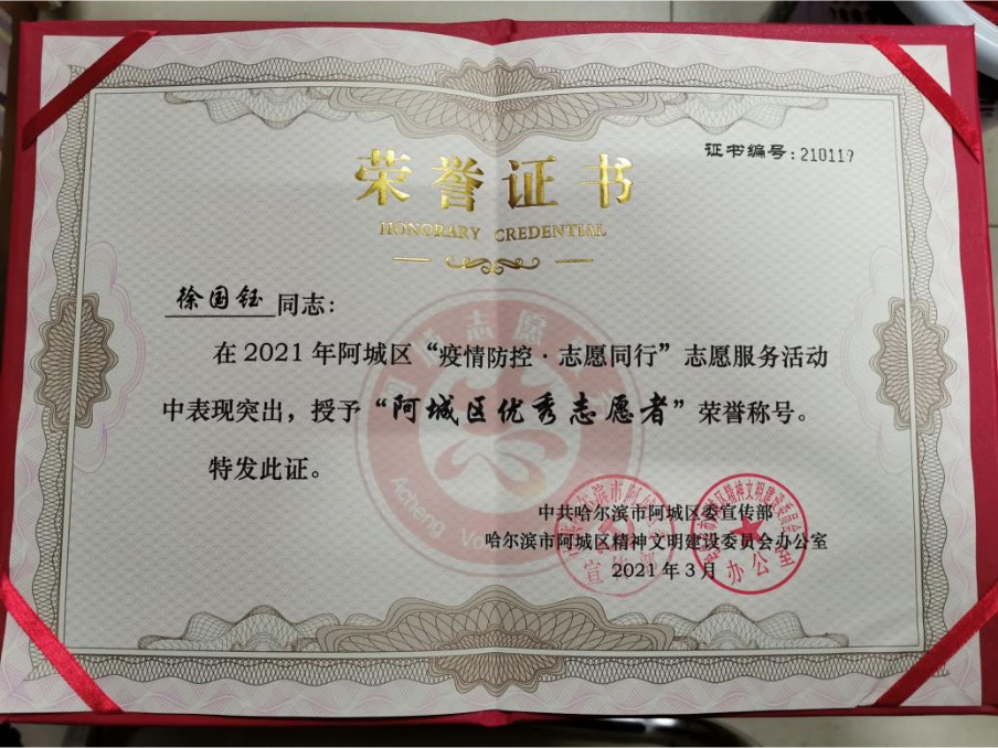 徐国钰获得“阿城区优秀志愿者”荣誉称号
