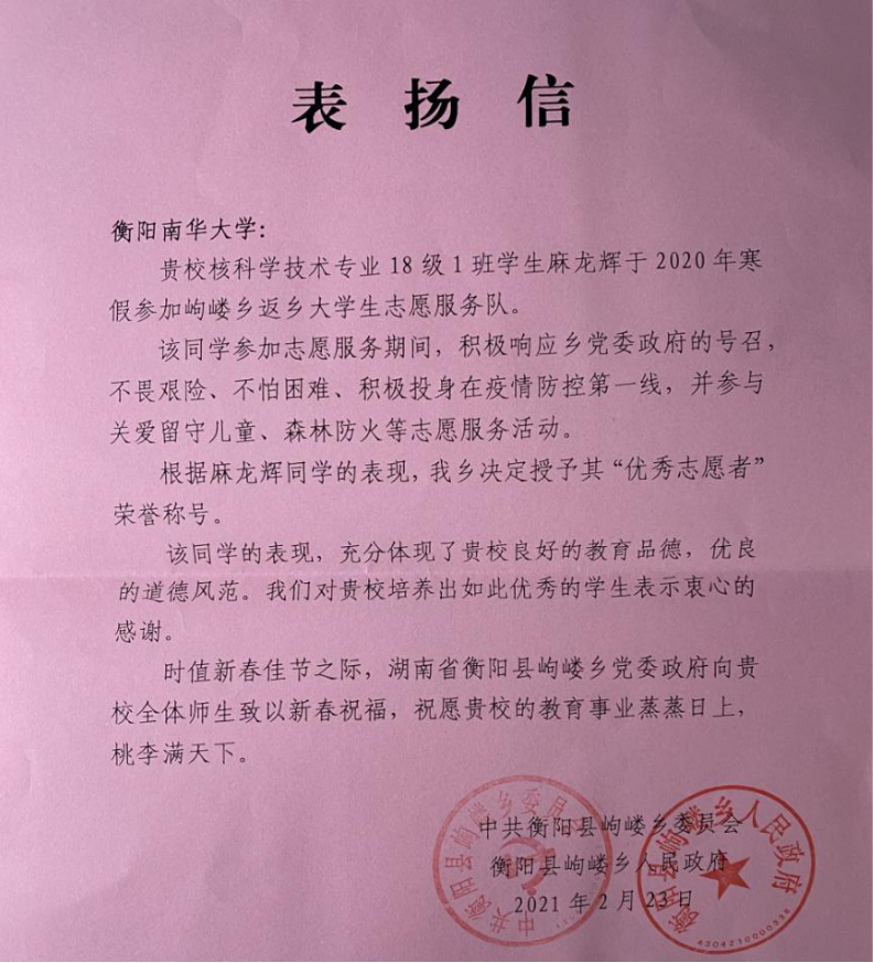 第二员工党支部党员、核物理专业2018级的麻龙辉同学寒假期间积极参加衡阳市衡阳县岣嵝乡返乡老员工志愿服务队。加入志愿服务队后,麻龙辉成为宣传大队的一名成员,第二天就开始了宣传疫情防控,深林防火的活动。通过挨家挨户发传单,耐心与老人交流,科普深林防火知识,朗读深林禁火令,让更多人了解到安全用火的重要性。麻龙辉说:“开展此次社会实践活动,我感觉到了深刻的意义,我深入到基层群众中去锻炼和提升自己,服务帮助他人。作为一名岣嵝乡籍人员,我要守住乡村这片净土,为乡村疫情防控、经济发展、环境保护贡献自己的一份力量。作为一名当代老员工,我要走出校园,深入基层,将理论与实践相结合,为完善乡村治理体系献计献策。作为一名中共党员,我要贯彻落实党中央精神,响应国家号召,守初心担使命,去关心帮助困难群众,为全面打赢疫情防控歼灭战,建设美丽乡村添砖加瓦。”