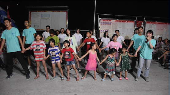 下午,团队成员周子强与孩子们一起互动交流,留下了成长寄语,并播放了爱国主义教育宣传片,之后约好在晚上的文艺汇演中与公司成员一起表演《国家》手语操。当晚,公司共表演二十四式简化太极拳和《国家》手语操两个节目,博得满堂喝彩。