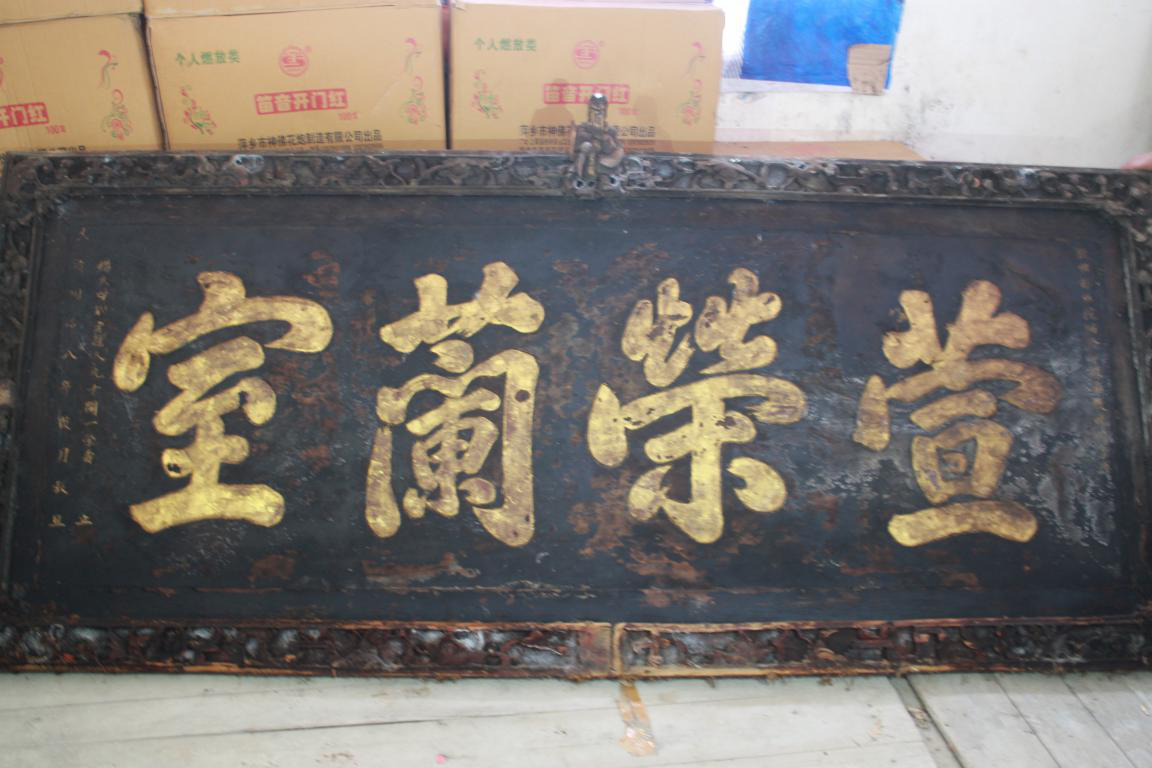 下午6时,大皮口文化宣传队抵达了“萱榮蘭室”牌匾持有者家中,对牌匾进行拍摄与了解,这是“萱榮蘭室”牌匾首次面世。“萱榮蘭室”牌匾制作于同治五年,为周崇傅赠予刘老孺人祝贺其八十一大寿的寿礼,牌匾由铜制成,边框为花型图案,其上部有一仙人驾鹤浮雕,样式精美生动,与牌匾一同面世的还有“婺焕中天桃實霞觴叠進,堂開晝锦蘭孫桂子聯芳”的对联。