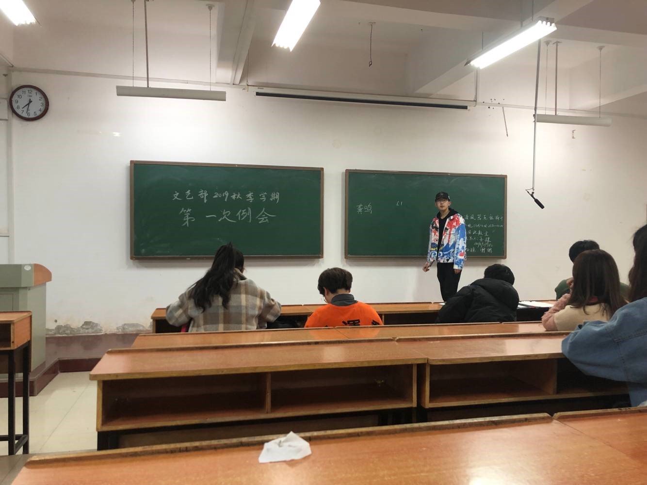 会议开始,新部员龚鸣上台进行自我介绍,简述了自己的兴趣爱好,并表达了日后与文艺部其他成员共同努力的信心和决心。