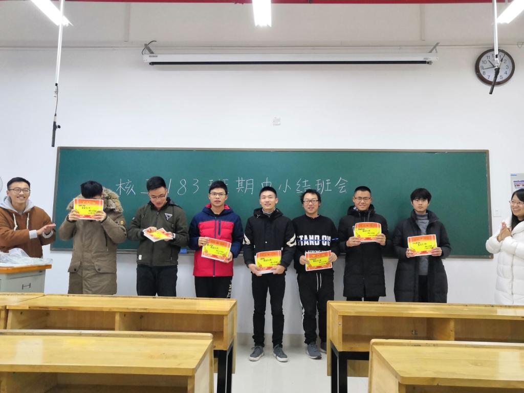 会议伊始,刘紫静、班长何山郅、团支书敖韬对上半学期有卓越表现的员工颁发了奖状和奖品。王昌、马诗桂、常皓彤、何山郅的高等数学成绩名列年级前十,陶然、唐江、隆鹏陈凭借优异的英语成绩荣获了“最爱学习奖”。肖豪在画法几何与工程制图课上展现的惊人的制图能力,使他在老师和员工间有着良好的口碑,因此获得了“绘图金童奖”。杨爽带领其队伍在公司18级“新生杯”篮球赛上屡战屡胜,最终夺得冠军,被授予“篮球场魅影奖”。除此之外,核工183班女生在日常生活中积极进取,为团结183班集体做出了不可磨灭的贡献,获得了由男生们所颁发的“不宠你宠谁奖”。